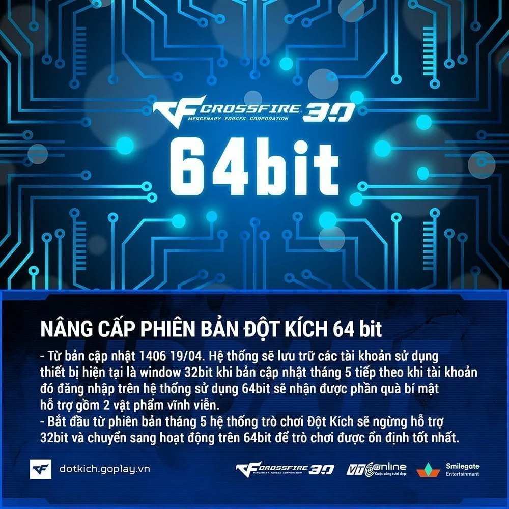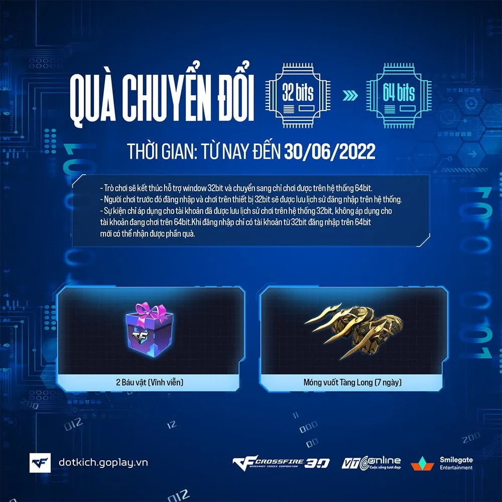 Ngoài ra, trong bản cập nhật 30/6 này NPH VTC Online cũng “bật mí” là sẽ mang theo quà tặng cho người chơi chuyển đổi 64bit. Trước đó, Đột Kích đã thông báo từng bước dừng hỗ trợ bộ cài game 32bit và khuyến khích người chơi thay đổi bộ cài sang 64bit giúp game hoạt động ổn định hơn. Những người chơi sau khi chuyển đổi, lần đầu đăng nhập vào bộ cài 64bit sẽ được sở hữu bộ quà tặng bí mật từ NPH.