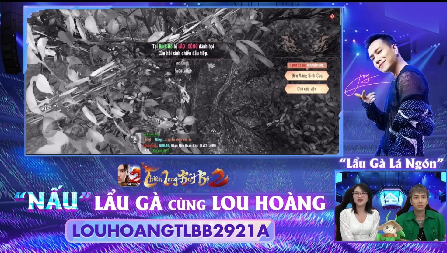 Bên cạnh những chia sẻ đầy thú vị, anh cũng đã tham gia vào trận đấu so kè kỹ năng cùng các chiến hữu tại server 3. Ca sĩ Lou Hoàng sử dụng nhân vật LẩuGàLáNgón tại S3 và xuất hiện ngẫu nhiên trong các map PK của Thiên Long Bát Bộ 2 VNG. Bất cứ người chơi nào tiêu diệt thành công nhân vật LẩuGàLáNgón sẽ nhận được những phần quà khủng từ Nhà phát hành.