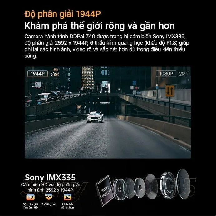 Camera hành trình DDPai Z40 được trang bị cảm biến Sony IMX335, độ phân giải 2592 x 1944P, 6 thấu kính quang học (khẩu độ F1.8) giúp ghi lại các hình ảnh, video rõ và sắc nét hơn dù trong điều kiện thiếu sáng.