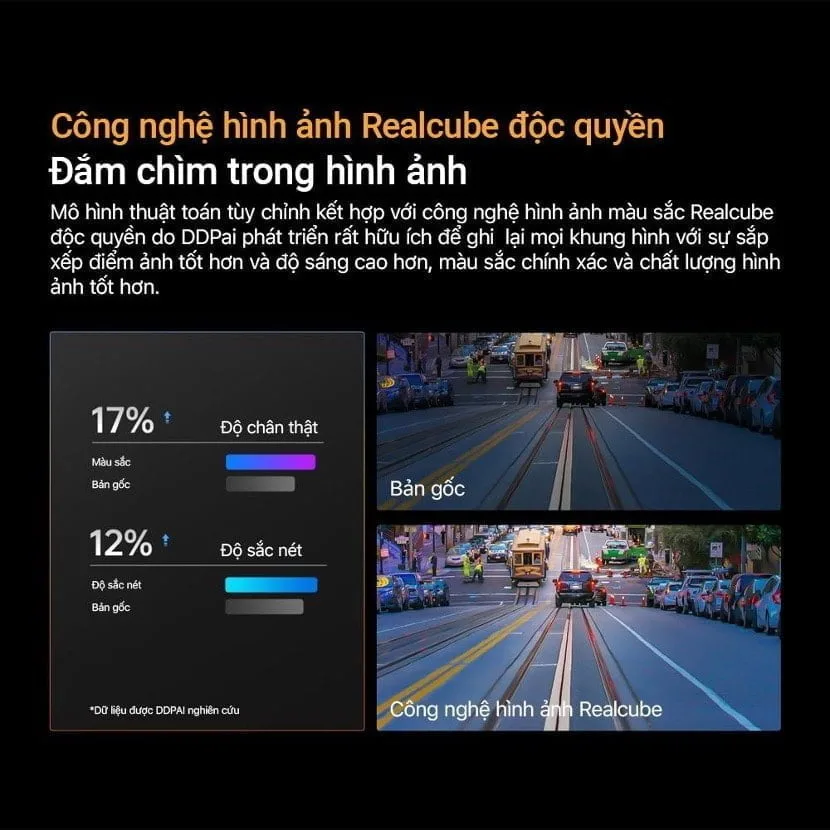 Công nghệ hình ảnh Realcube độc quyền do DDPai phát triển rất hữu ích để ghi lại mọi khung hình với sự sắp xếp điểm ảnh tốt hơn và độ sáng cao hơn, màu sắc chính xác và chất lượng hình ảnh tốt hơn.