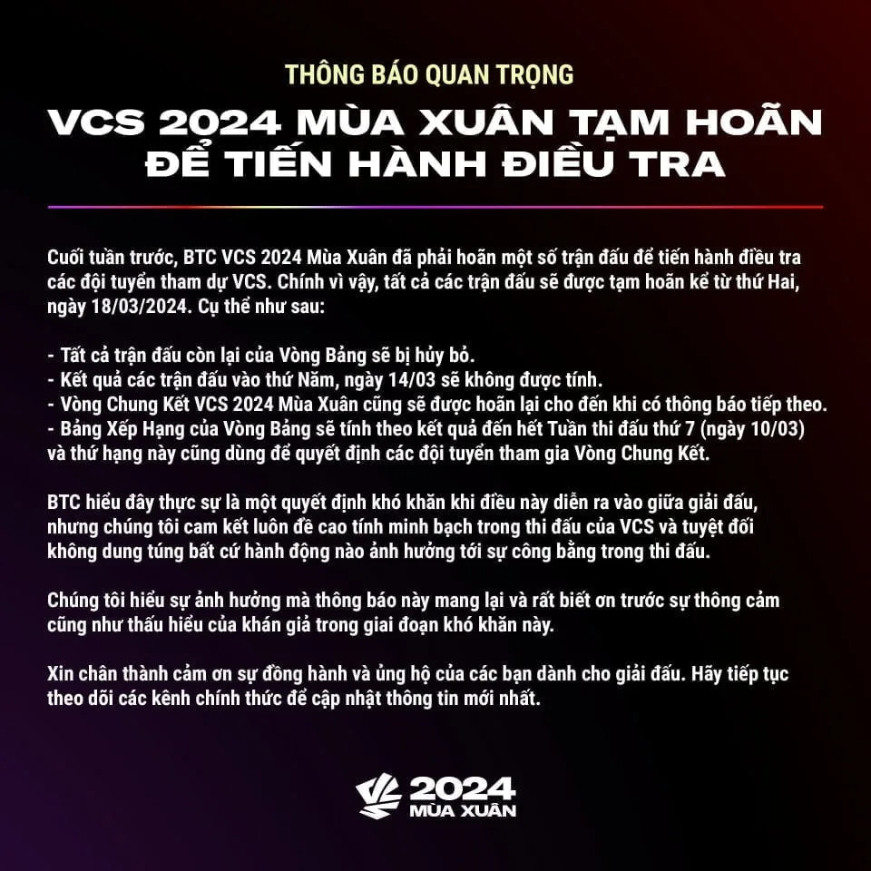 – Vòng Chung Kết VCS 2024 Mùa Xuân cũng sẽ được hoãn lại cho đến khi có thông báo tiếp theo.