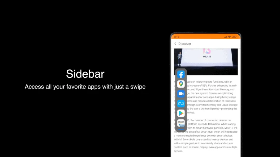 Sidebar là một công cụ hiệu quả khác trong MIUI 13, cho phép bạn truy cập tất cả các ứng dụng yêu thích của mình trong các cửa sổ nổi chỉ bằng một cái vuốt/chạm — mà không cần thoát khỏi ứng dụng hiện tại của bạn. Điều này là hoàn toàn hoàn hảo cho những người dùng làm việc đa nhiệm mong muốn có thể kéo nhiều ứng dụng lên cùng một lúc hoặc nhanh chóng hoán đổi chúng một cách dễ dàng hơn. Bạn cũng có thể tùy chỉnh tính năng này với tối đa 10 ứng dụng trong sidebar.