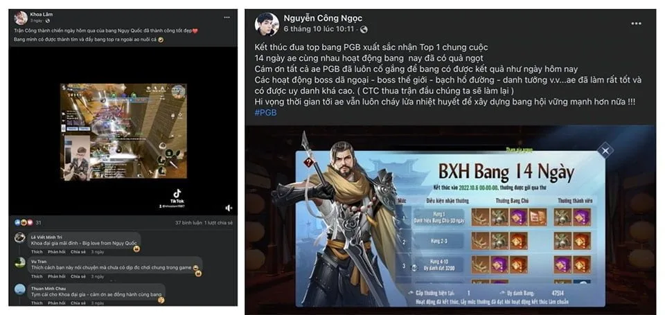 Bên cạnh đó, người chơi còn khoái chí chia sẻ những câu chuyện “dở khóc dở cười” đằng sau những trận thư hùng thâu đêm cực kỳ gây cấn và căng thẳng. Đại hiệp Thuan Minh Chau nhớ lại: “Chuyện là tối qua, anh em đánh đổ mồ hôi sôi nước mắt vớt được cái top 9 Công Thành Chiến S2. Thằng đệ em nó off đến 23h xong vào hú hét như đúng rồi nhận vơ công cán…”. Đây chắc chắn là những kỷ niệm khó phai của tất cả game thủ khi tham gia tính năng kinh điển này của Võ Lâm Truyền Kỳ MAX.