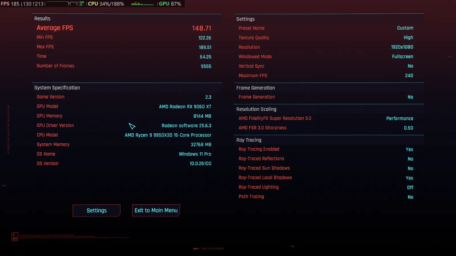 Ở các cảnh phức tạp, tốc độ khung hình dù không chạm đến ngưỡng tối đa của màn hình 144Hz, nhưng vẫn đủ cao để tạo cảm giác mượt và dễ điều khiển. Đây là test đánh dấu vùng hiệu năng “có thể chơi tốt” của RX 9060 XT. Trải nghiệm thực tế cho thấy sự cân bằng giữa hiệu suất và chất lượng hình ảnh được tối ưu rõ rệt ở mức Quality, phù hợp với người dùng muốn tận dụng Ray Regeneration High mà không bị đánh đổi quá nhiều về tốc độ.