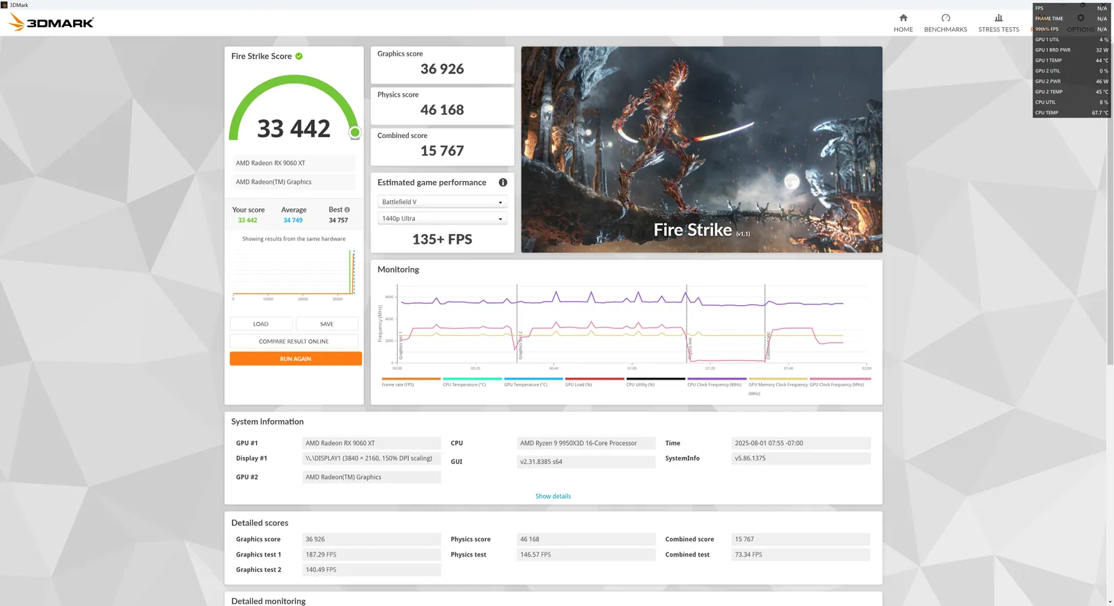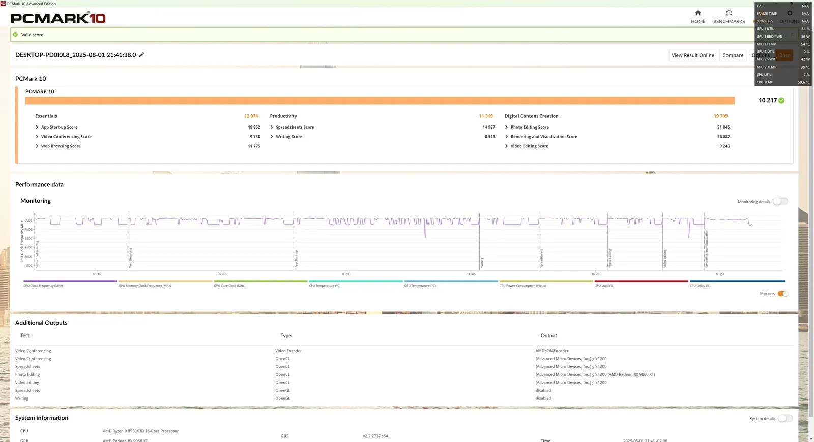 Trong quá trình chơi thực tế, công cụ theo dõi hiệu năng ghi nhận GPU hoạt động ổn định ở mức sử dụng trung bình 97%, nhiệt độ khoảng 46°C, trong khi CPU tải trung bình chỉ 27%. Nhờ đó, các phép đo tốc độ khung hình phản ánh đúng tác động của từng thiết lập Ray Regeneration và FSR 4, đảm bảo tính nhất quán giữa các bài test.