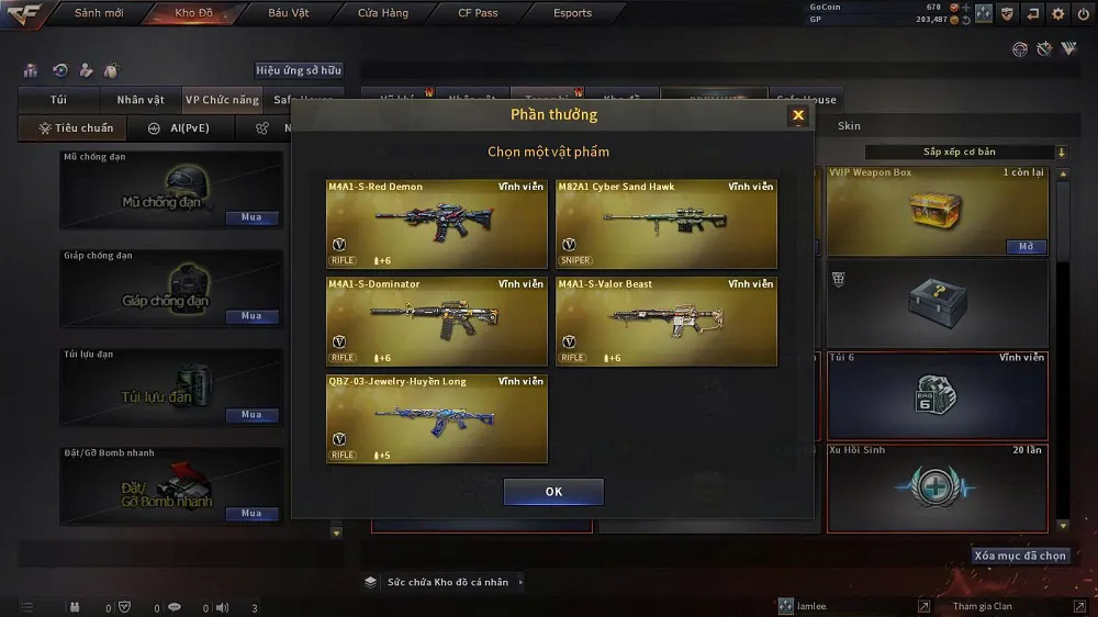- Hòm tùy chọn vũ khí VIP: M4A1-S-Red Demon, M82A1 Cyber Sand Hawk, M4A1-S-Dominator, M4A1-S-Valor Beast, QBZ-03 Jewelry Huyền Long.
