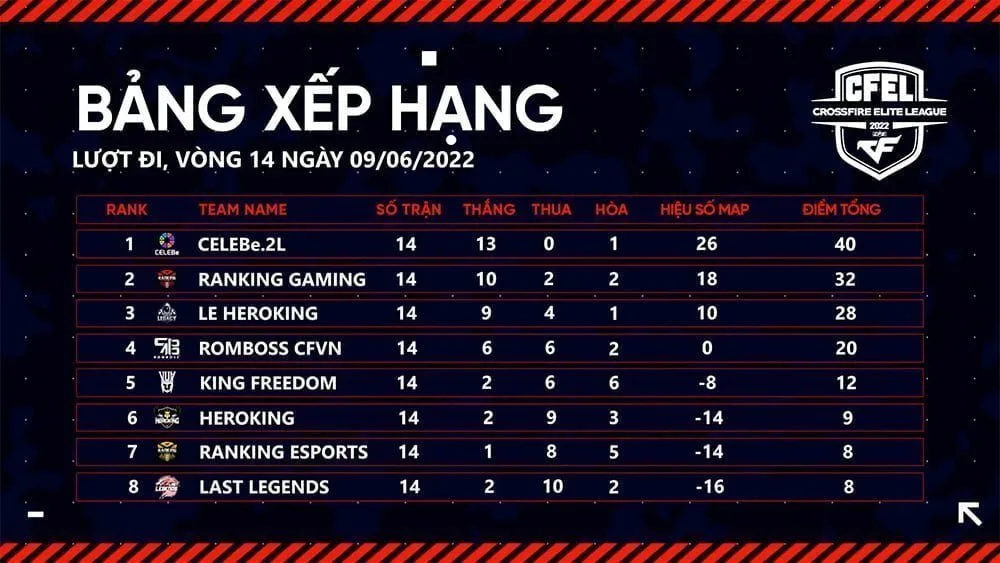 Kết quả cuối cùng chức Vô địch thuộc về CELEBe.2L, Á quân thuộc về LEGACY HEROKING, Top 3 thuộc về RANKING GAMING và Top 4 là hạt giống phong trào đi lên từ CLAN WAR – ROMBOSS CFVN.