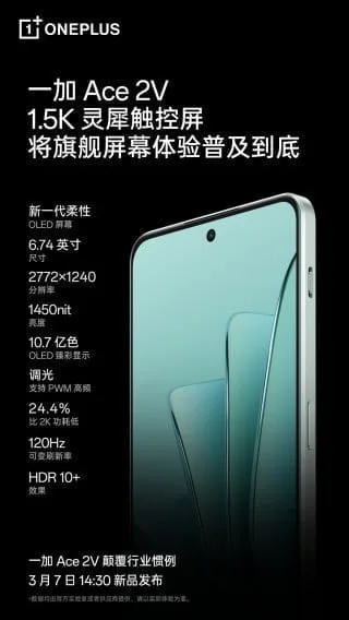 OnePlus Ace 2V sẽ có màn hình AMOLED 6,74 inch đạt chuẩn 10 bit màu với độ phân giải 2772 x 1240, cùng tốc độ làm mới 120Hz và độ sáng lên tới 1.450 nits. Quan trọng hơn hết, viền màn hình trên chiếc điện thoại đã được làm mỏng hơn, giúp mang lại tính thẩm mỹ cao hơn.