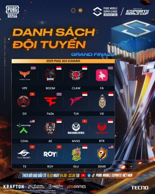 Tại Vòng Chung kết 2025 PMSL SEA Summer, 4 đại diện PUBG MOBILE Việt Nam cũng sẽ có cơ hội đối mặt 12 đối thủ đa dạng từ nhiều khu vực. Indonesia đóng góp nhiều nhất với 7 đội, trong khi Thái Lan và Malaysia lần lượt là 3 và 2. Các cựu vương như Alter Ego Ares, BOOM Esports (cùng đến từ Indonesia) hay Vampire Esports (Thái Lan) vẫn sẽ tham chiến, hứa hẹn tạo nên 3 ngày cuối tuần tranh tài khốc liệt tại Nhà thi đấu GBK và cam go với 4 đội tuyển Esports nước nhà.