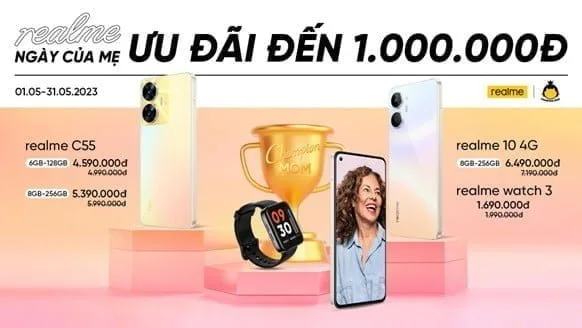 Nhân ngày của Mẹ năm 2023, realme tung chương trình ưu đãi xuyên suốt tháng 5 khi mua điện thoại thuộc dòng C, realme 9 series, realme 10 và nhiều sản phẩm công nghệ khác tại toàn bộ chuỗi bán lẻ trên toàn quốc.