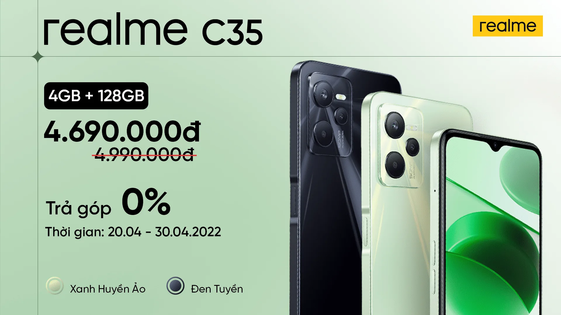 Từ 20/4/2022 đến 30/4/2022, phiên bản nâng cấp 4GB/128GB của realme C35 được giảm trực tiếp 300.000 đồng