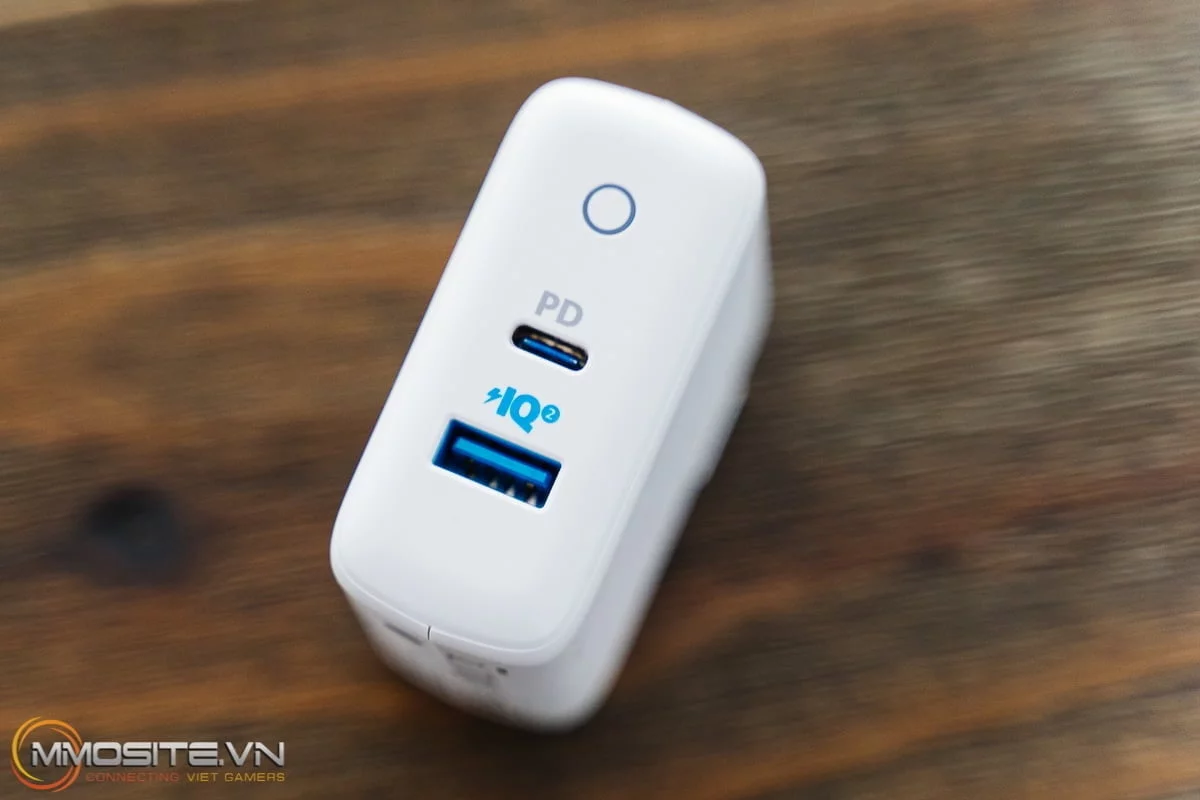 Anker PowerPort PD+2 là một sự lựa chọn hoàn hảo cho những ai hay di chuyển và có nhiều thiết bị cần phải sạc nhanh. Dù rằng cổng USB-A đang dần dần được thay thế bởi USB-C nhưng rõ ràng vẫn còn tồn tại rất nhiều thiết bị sử dụng cổng này. Nhà sản xuất đã in rõ trên thiết bị 2 logo là PD (power delivery) và IQ2 (PowerIQ 2.0) – 2 công nghệ giúp bạn biết được đây là thiết bị sạc nhanh. Ở phía trên còn có 1 đèn led báo nguồn, đèn này sẽ có ánh sáng màu xanh nhưng không quá chói để bạn luôn có thể nhận biết khi sử dụng trong phòng tối.