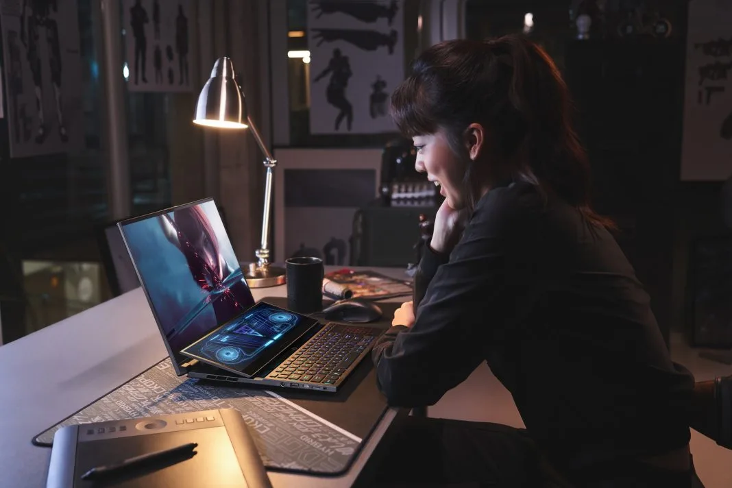 Về công nghệ, màn hình chính của ROG Zephyrus Duo 16 sử dụng tấm nền Mini LED siêu sáng lên tới 1100 nits, với độ phân giải 2K 165Hz, 100% dải màu DCI-P3, đạt chuẩn VESA DisplayHDR 1000 cùng 512 vùng tối cục bộ, cho trải nghiệm HDR tuyệt vời nhất. Nhờ công nghệ AmLED của AUO và ROG Nebula HDR Engine, ROG Zephyrus Duo 16 sẽ sử dụng đèn nền cực kỳ chính xác để làm mờ cục bộ tạo ra độ tương phản tuyệt đẹp. Sự kết hợp giữa phần mềm và phần cứng này sẽ giúp cung cấp hình ảnh cực kỳ chính xác và giảm tối đa hiện tượng quầng sáng haloing.