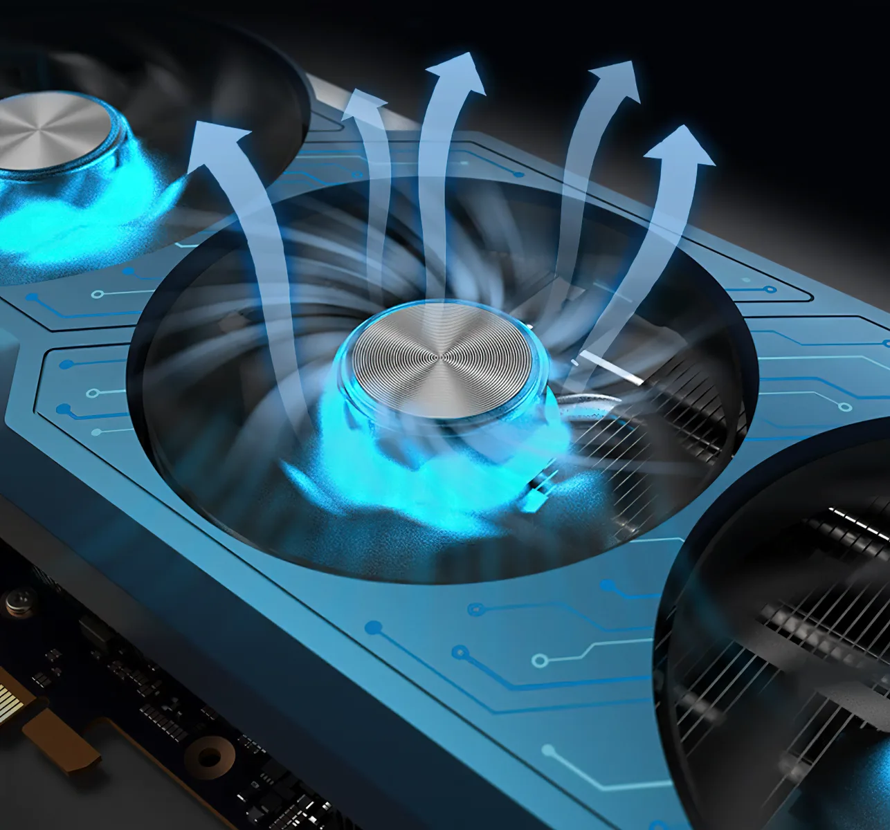 Hệ thống tản nhiệt hiệu suất cao với nhiều ống đồng dẫn nhiệt giúp làm mát GPU mà không cần giảm hiệu năng. Card sử dụng PCB 10 lớp với các thành phần cao cấp và được cấp nguồn bằng phích cắm 8+6 chân. Chiếc card có tone màu aquamarine và quạt có đèn RGB. Card có kích thước 310x128x51mm.
