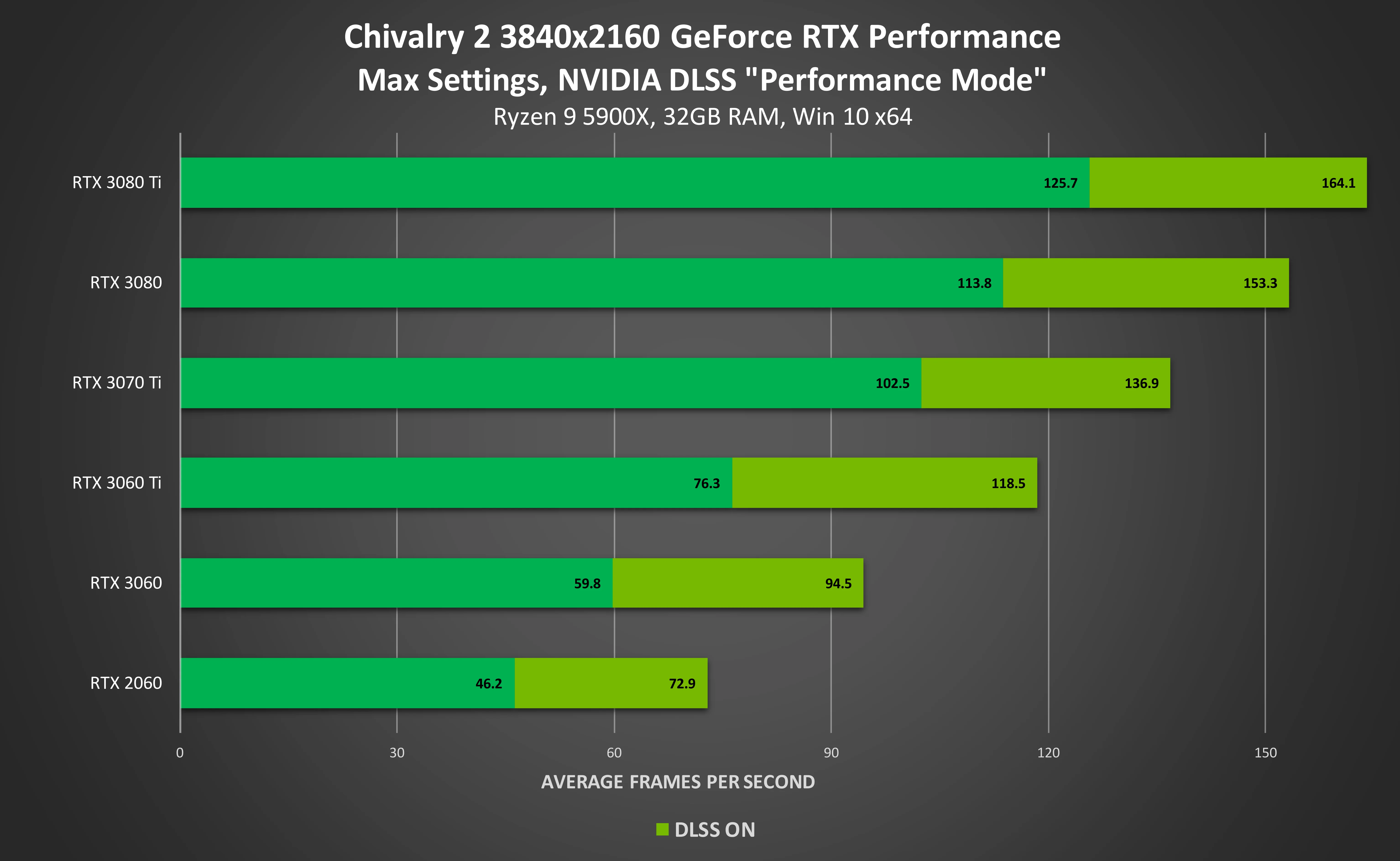 Với sự hỗ trợ của DLSS 2.0 – sẽ có trong bản cập nhật mới nhất chuẩn bị ra mắt – Chivalry 2 sẽ được tăng cường tới 45% hiệu suất hoạt động; giúp mọi game thủ sở hữu card đồ hoạ RTX có thể chơi game mượt mà ở 4K 60 FPS cùng thiết lập đồ hoạ ở mức tối đa.