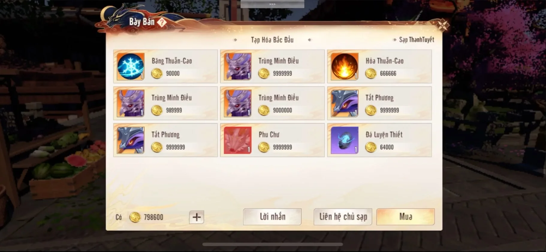 Hầu như tất các vật phẩm đều có thể bày bán, chỉ cần không phải là vật phẩm bị khóa. Bạn có thể bán từ vũ khí, trang bị không khóa cho đến thuốc men chữa máu, ngọc khảm, nguyên liệu cường hóa, nguyên liệu chế luyện… Vật phẩm được bán bằng đơn vị Nguyên Bảo vì thế đây được xem là công cụ “kiếm tiền” đắt giá dành cho các game thủ chơi theo hệ không nạp. Bạn có thể “cần cù bù thiếu thốn” bằng cách cày các món hàng mà thị trường cần rồi bán để lấy Nguyên Bảo mua những thứ mà mình không tiếp cận được khi chơi không nạp.