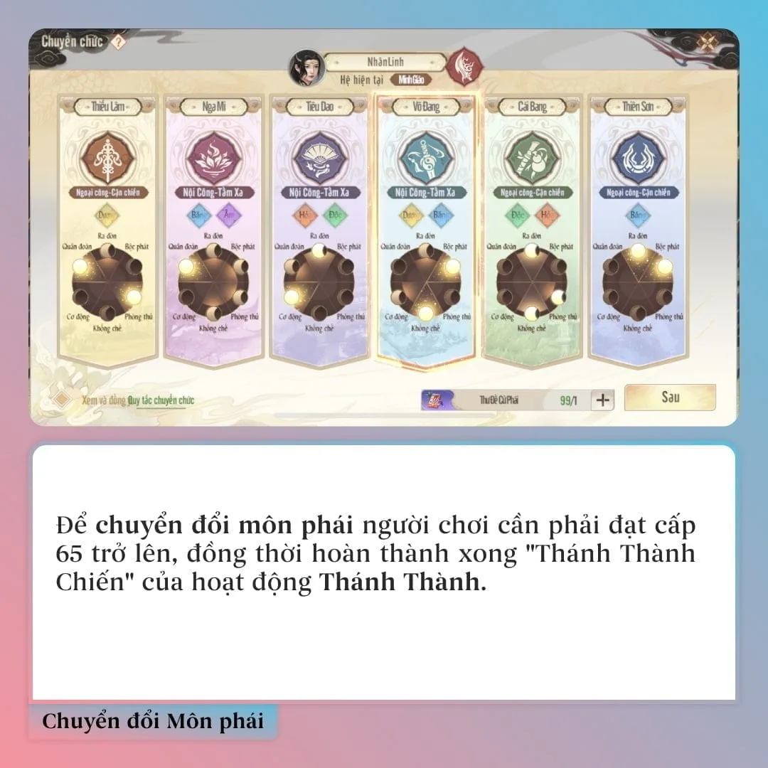 Bên cạnh sự xuất hiện môn phái mới, tính năng Chuyển Đổi Môn Phái sẽ tự động mở khi người chơi hoàn thành nhiệm vụ tại Khai Tông Lập Phái giai đoạn 3. Để sở hữu Cấp Chuyển chức nhân vật của người chơi phải đạt từ cấp 65 trở lên, đồng thời hoàn thành hoạt động Thánh Thành. Với tính năng này, game thủ sẽ đến gặp NPC để có thể chuyển chức, thuộc tính.