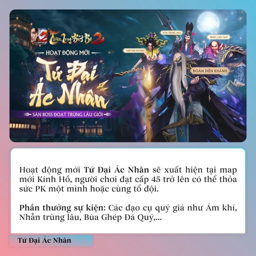 Hoạt động Tứ Đại Ác Nhân sẽ đem đến cho game thủ những cuộc đụng độ vô cùng nhiệt lửa. Mỗi ngày từ 13h đến 21h, Tứ Đại Ác Nhân sẽ xuất hiện tại map mới Kính Hồ. Mỗi đợt hoạt động sẽ có một boss Trùm Cuối, 3 boss Đại và 20 boss Nhỏ, người chơi cần tiêu diệt boss để nhận những phần thưởng cực khủng như Trùng Lâu Giới, Trang bị Ám Khí, Đá Khảm, Bùa Ghép Đá,…