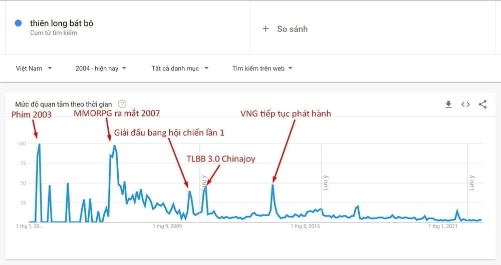 Dù đã trải qua rất nhiều năm nhưng thương hiệu Thiên Long Bát Bộ vẫn là một từ khóa tìm kiếm khá tốt ở Việt Nam. Thống kê do Google Trends cho thấy sau khi phiên bản game MMORPG Thiên Long Bát Bộ (PC) phát hành thì số lượng tìm kiếm từ khóa này tại Việt Nam bắt đầu sống dậy và chưa từng “chết” (về 0) bao giờ. Các lần xu hướng tăng cao của lịch sử tìm kiếm cũng cho thấy ứng với các mốc của thương hiệu này như khi phát hành lần đầu năm 2007, công bố TLBB 3.0 tại Chinajoy 2011, chuyển giao game cho VNG năm 2014… và dự kiến các chỉ số này vẫn tiếp tục tăng đều trong thời gian tới.