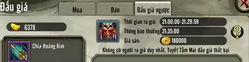 MMOSITE.vn – Tính năng Đấu Giá Ngược được thêm trong phần Đấu Giá, ngay bên cạnh hai mục mua bán đồ. Thời gian hoạt động chỉ diễn ra trong vòng 30 phút, từ 21:00 đến 21:30 hàng ngày. Mỗi ngày sẽ có 5 loại vật phẩm quý được đưa ra đấu giá, game thủ nào đưa ra cái giá rẻ nhất và duy nhất sẽ được quyền trả KNB mua về.