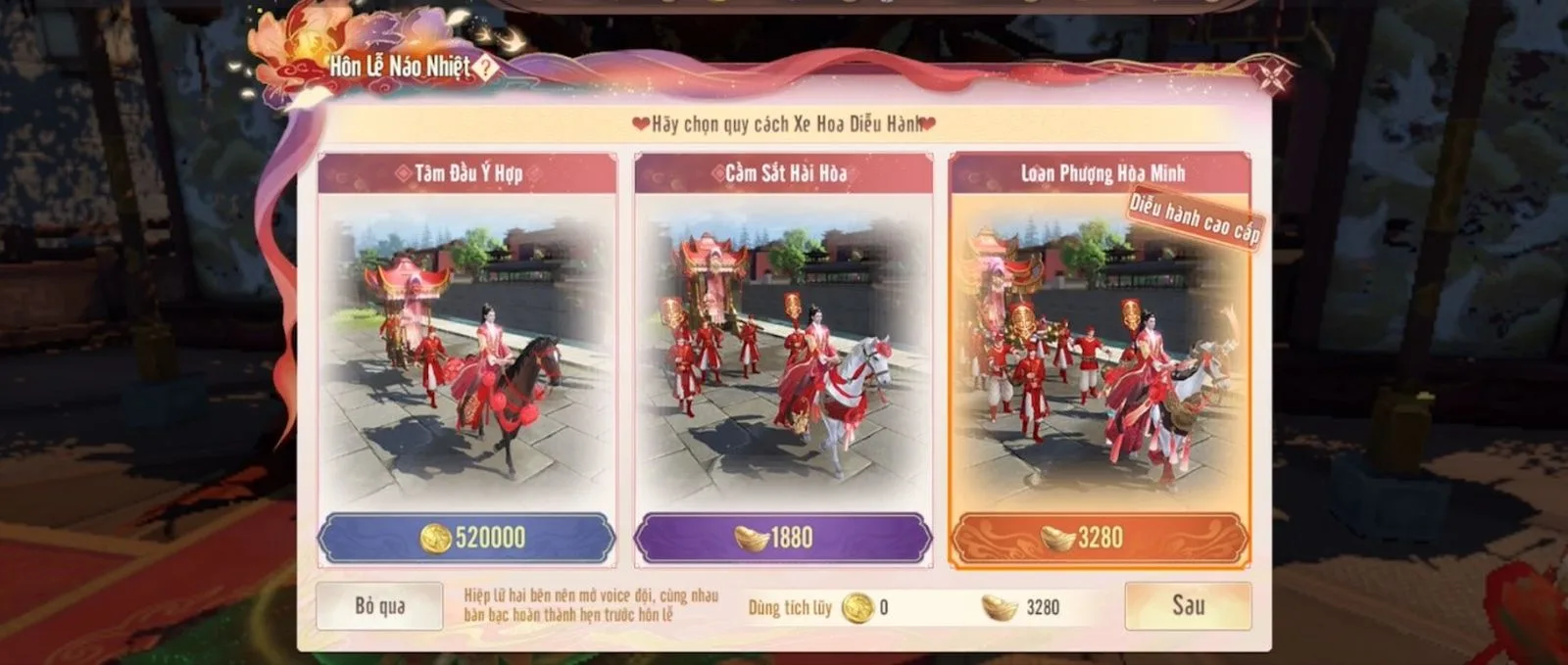 Điều đáng mong chờ nhất của game thủ giờ đây đã trở thành hiện thực, các cặp đôi đã có thể tổ chức hôn lễ và “flex” những màn rước dâu linh đình. Khi kết bái phu thê thành công, người chơi có thể trò chuyện với Nguyệt Lão để tiến hành chuẩn bị đám cưới như mở Xe Hoa Diễu Hành và Hôn Lễ Hỷ Đường cho riêng mình. Tại đây, người chơi có thể chọn các loại xe hoa theo phong cách và quy mô khác nhau như Tâm Đầu Ý Hợp, Cầm Sắt Hài Hòa, Loạn Phượng Hòa Minh tuỳ mức độ chịu chi của các cặp đôi, kèm theo đó là những bộ sính lễ và quà tặng khác nhau.