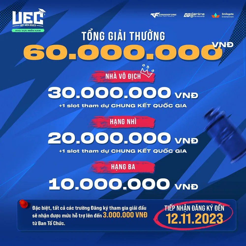 Cũng như các đấu thủ miền Bắc, những đội tuyển tham gia UEC Đột Kích 2023 khu vực phía Nam sẽ tranh tài để tìm ra 3 đội mạnh nhất giành suất vào chung kết tổng toàn quốc. Đội vô địch lần này sẽ nhận số tiền thưởng là 60.000.000đ, đội Á quân sẽ nhận 20.000.000đ và hạng 3 sẽ cầm về 10.000.000đ.