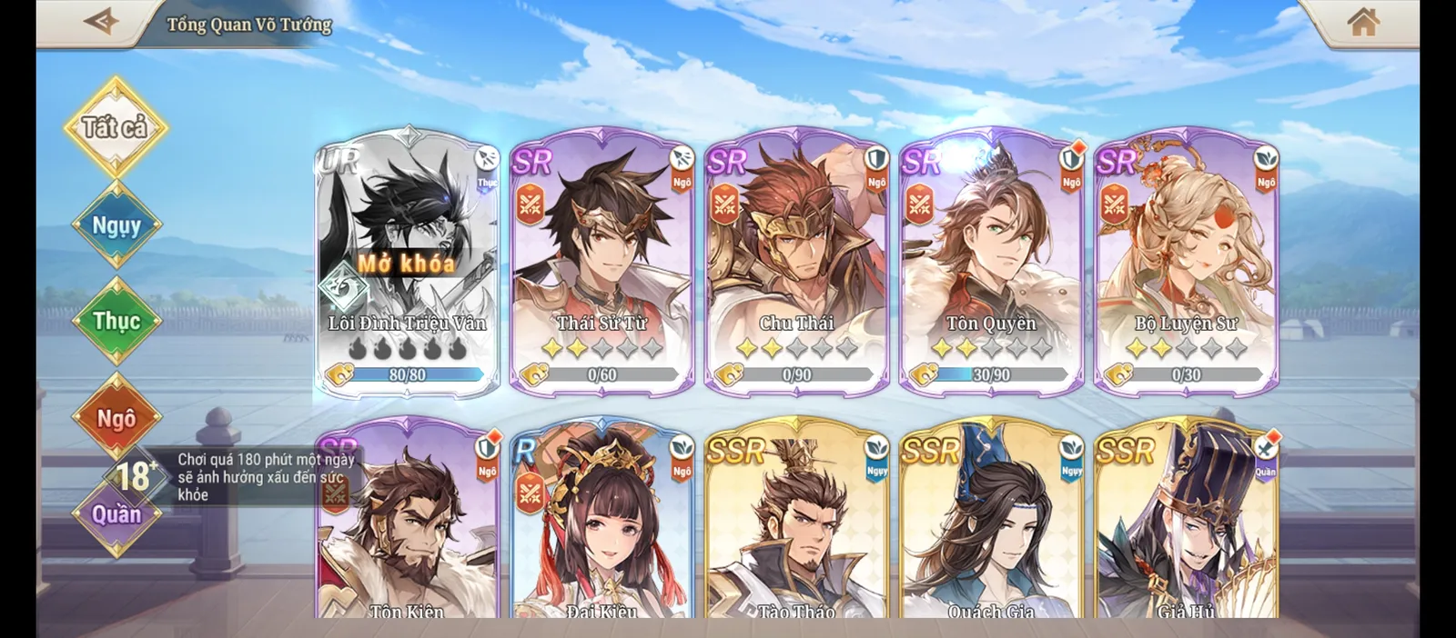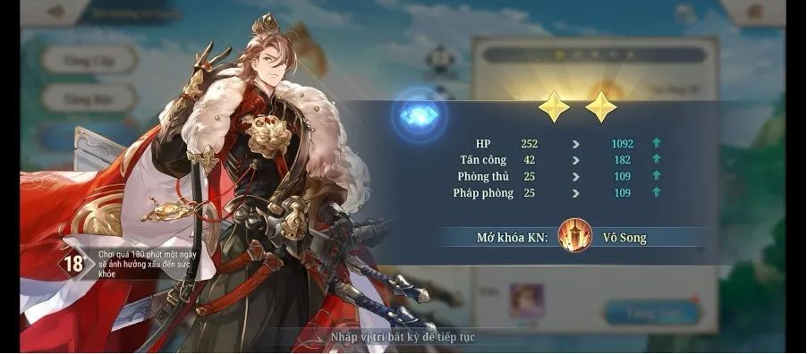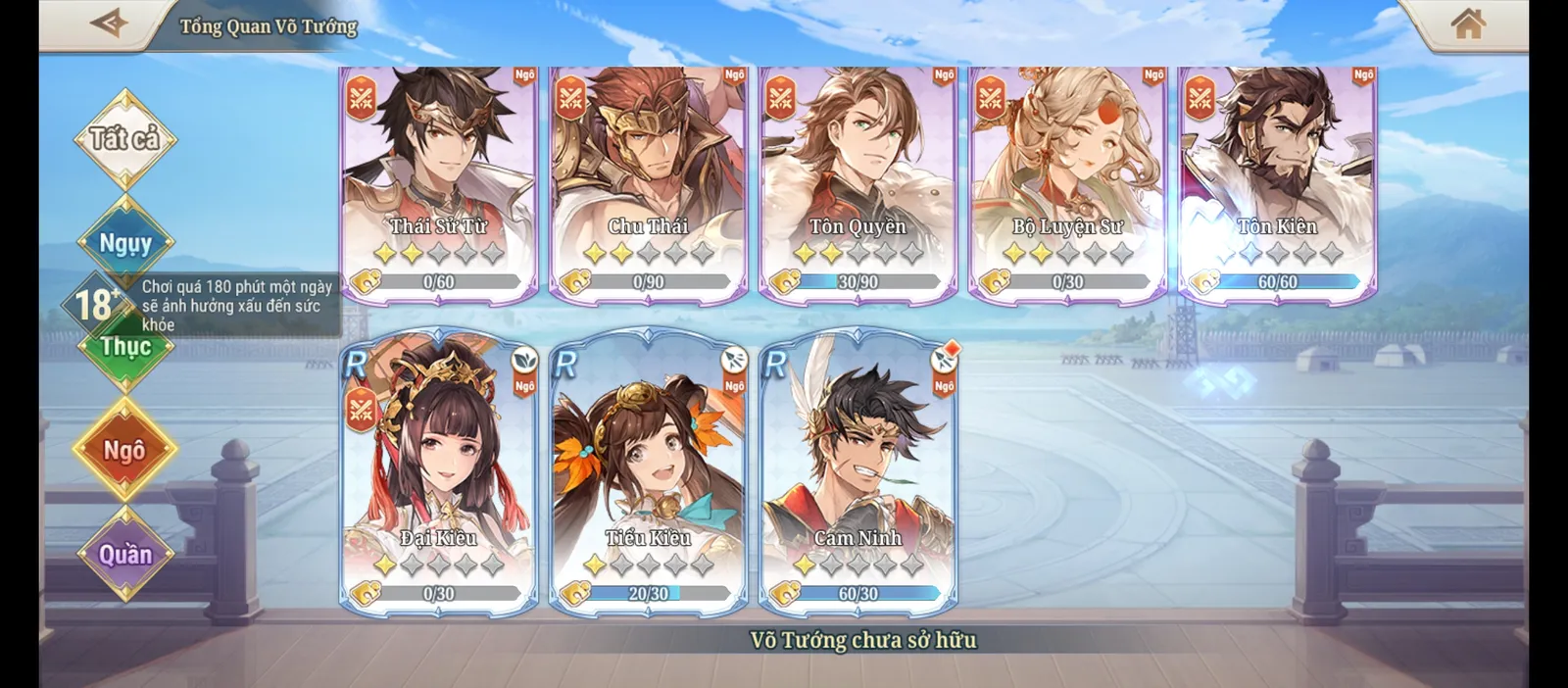 Việc nâng cấp một tướng từ R lên phẩm chất cao cũng không quá khó khăn. Người chơi chỉ cần thu thập mảnh tướng để lên cao và cần thêm Đá thức tỉnh võ tướng khi nâng UR. Những nguyên liệu có thể nhận được miễn phí thông qua việc tham gia đầy đủ các hoạt động trong ngày. Ngoài ra, các tướng cũng không có cơ chế “khóa sức mạnh” để buộc người chơi phải chi tiền, mọi thứ đều có thể đạt được thông qua trải nghiệm và đầu tư thời gian hợp lý.