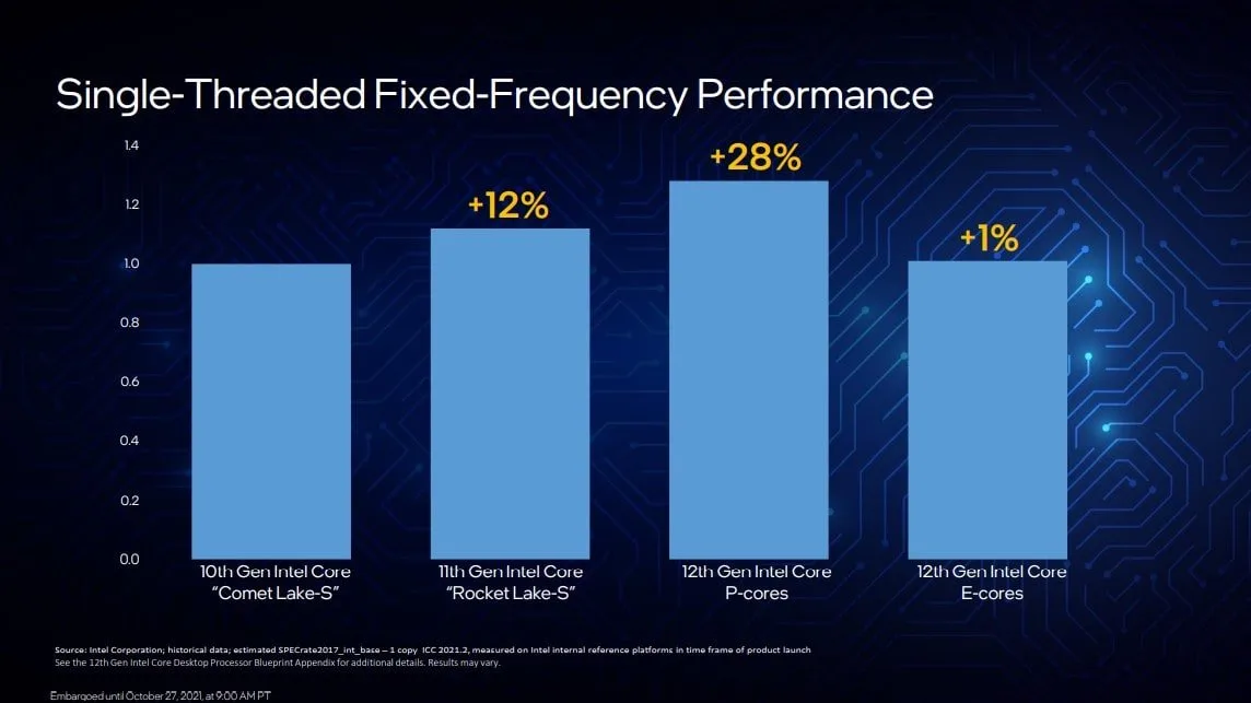 Các nhân P-core sẽ dùng kiến trúc Golden Cove giúp hiệu năng IPC tăng cường đạt 19%, hiệu năng đơn nhân cao hơn 28% so với Comet Lake (thế hệ 10) và hơn 12% so với Rocket Lake (Gen 11). Còn nhân E-core sẽ dùng kiến trúc Gracemont từng thấy trên các đời CPU tiết kiệm điện như Celeron hoặc Atom. Hiệu năng của E-core thế hệ 12 từ Intel vẫn cao hơn nhân xử lý thông thường của thế hệ Comet Lake (gen 10).