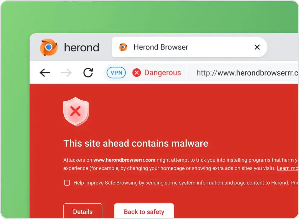 • Herond Shield: “Tấm khiên” mạnh mẽ của Herond sử dụng công nghệ AI để phát hiện và chặn phần mềm độc hại, lừa đảo và các nguy cơ khác trên Internet. Tính năng này có thể phân tích nội dung trang web, các đường dẫn (link) và tệp đính kèm (file) để xác định các mối đe dọa tiềm ẩn.