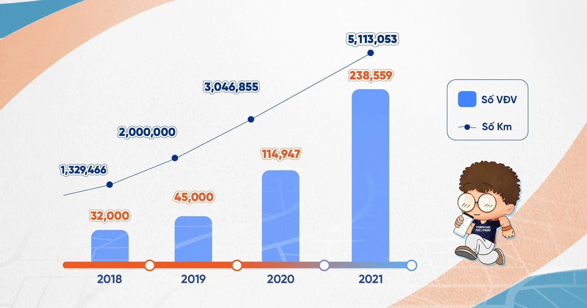 Một lần nữa, UpRace đã tự phá vỡ kỉ lục của chính mình khi hoàn thành mục tiêu “không tưởng”: 5.113.053 km đã được cộng đồng người chạy (runner) hoàn thành trong 22 ngày (31/10 – 21/11). Đáng chú ý, số người đăng ký tham gia UpRace 2021 tăng hơn gấp đôi so với năm 2020, từ 115.000 người lên đến hơn 238.000 người.