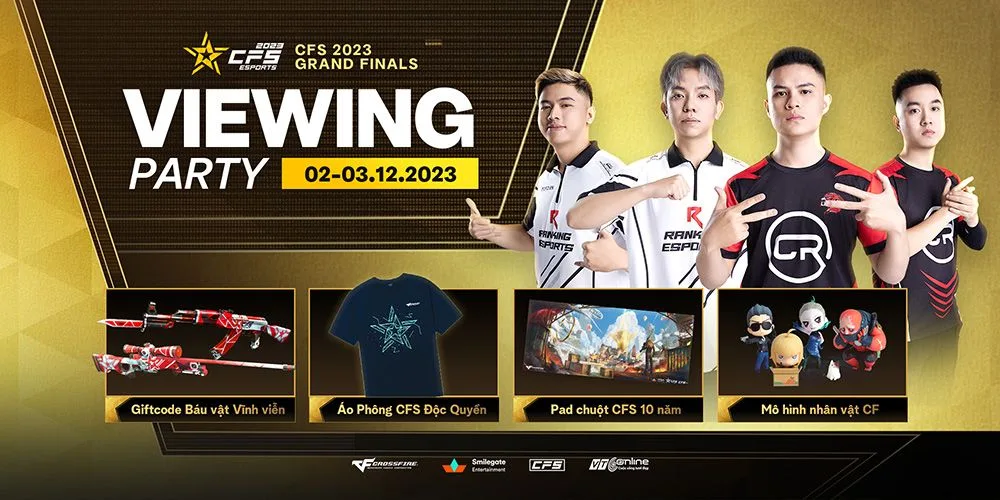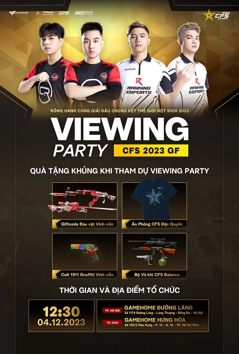 Giải đấu CFS 2023 Grand Finals đang diễn ra với những trận đấu Đột Kích sôi động nhất hành tinh. Việt Nam cũng góp mặt trong giải với 2 đội chuyên nghiệp làm đại diện là Ranking Esports và Carahouse.2L. Chính vì vậy, nhu cầu xem và cổ vũ của các game thủ Việt đang rất nóng trước và trong thời gian diễn ra giải đấu này. Từ đây, hoạt động Viewing Party hỗ trợ cổ vũ theo cộng đồng được NPH VTC Online phát động.