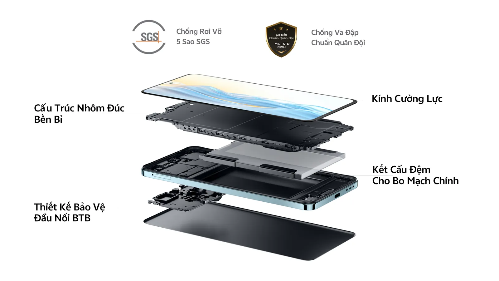 Vẻ đẹp tinh tế song hành cùng độ bền ấn tượng, mang lại sự an tâm tuyệt đối cho người dùng. Máy được trang bị kính cường lực Schott Xensation α chịu lực vượt trội, đồng thời đạt chuẩn kháng bụi IP6X và kháng nước IPX4. Đặc biệt, vivo Y39 5G còn là một trong số ít smartphone trong phân khúc đạt chứng nhận chống rơi 5 sao từ SGS và độ bền chuẩn quân đội, đảm bảo khả năng chống chọi hiệu quả trước các va đập và tác động từ môi trường sử dụng hàng ngày.