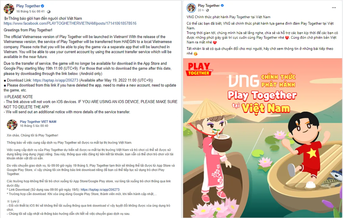Thông báo trên fanpage chính thức của Play Together về việc tựa game này sẽ được phát hành tại Việt Nam.