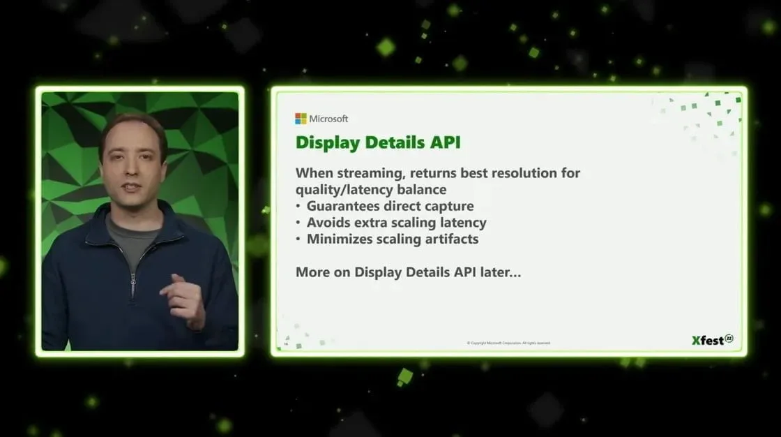 Hiện tại, giới hạn độ phân giải sẽ không còn là vấn đề đối với hầu hết các nhà phát triển trò chơi vì Xbox Cloud Gaming chia tỷ lệ trò chơi xuống 720p trên thiết bị di động và 1080p trên PC và web. Microsoft cuối cùng cũng sẽ hỗ trợ độ phân giải cao hơn. Brown giải thích: “Đó là điều mà chúng tôi mong đợi mang đến cho các bạn, dựa trên các thiết bị, điều kiện mạng khác nhau và những cải tiến đối với hệ thống phát trực tuyến”. Các công cụ sẽ sớm có sẵn cho các nhà phát triển để thử nghiệm trên các trò chơi và tìm nghiên cứu hỗ trợ Direct Capture.
