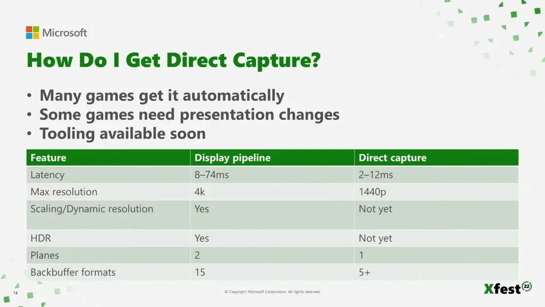 Bên cạnh hỗ trợ chuột và bàn phím, Microsoft cũng cung cấp cho các nhà phát triển nhiều công nghệ hơn để cải thiện độ trễ trong trò chơi của họ. Microsoft đã và đang làm việc trên một API mới, có thể tiết kiệm tổng thể độ trễ lên đến 72ms. Điều này đạt được bằng cách sử dụng Direct Capture, tính năng này tái tạo các tính năng trong phần mềm để loại bỏ thời gian chờ VSync.