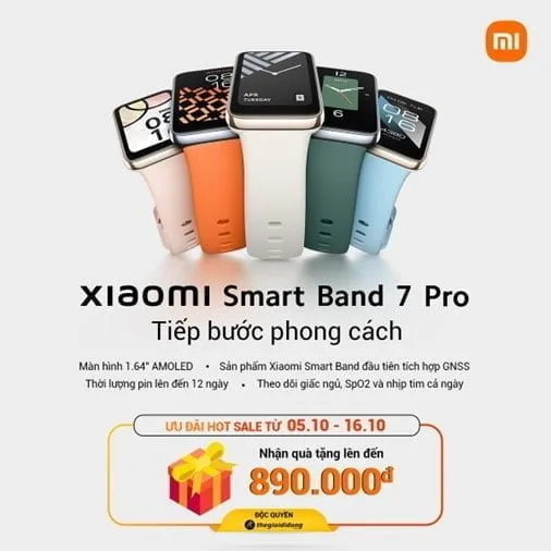 Đặc biệt, khi mua Xiaomi Smart Band 7 Pro từ ngày 05/10 tại các cửa hàng Thế Giới Di Động, khách hàng sẽ nhận ngay phần quà tai nghe trị giá 890.000đ.
