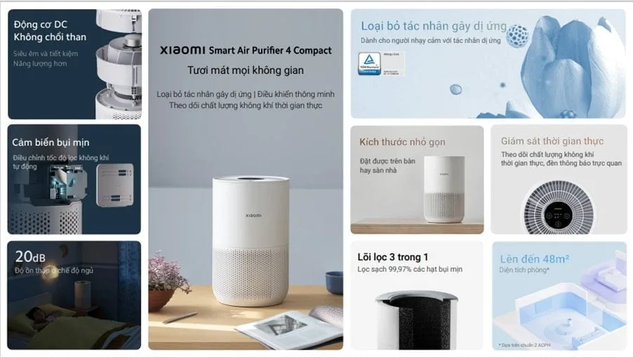 Máy lọc không khí có kích thước nhỏ gọn nhưng mạnh mẽ, phù hợp để sử dụng tại nhà hoặc văn phòng. Thiết bị có khả năng lọc sạch 99,97% bụi mịn, kích thức nhỏ đến 0,3 micron thông qua bộ lọc 3 trong 1 và loại bỏ các chất ô nhiễm không khí trong nhà thông thường một cách hiệu quả với tính năng lọc từng lớp. Theo TÜV Rheinland, máy lọc không khí thông minh Xiaomi 4 Compact được chứng minh là có khả năng lọc hiệu quả các chất gây dị ứng trong không khí.