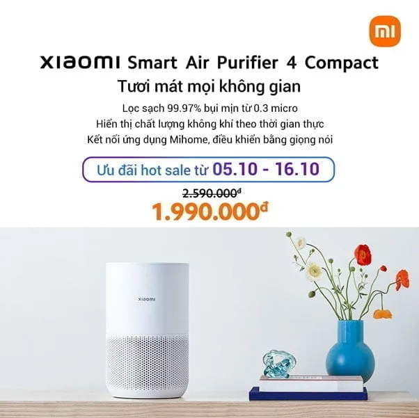 Đặc biệt, khi mua Xiaomi Smart Air Purifier 4 Compact từ ngày 05 đến ngày 16 tháng 10, khách hàng sẽ nhận ngay mức giá ưu đãi 1,990,000đ (giá bán lẻ là 2,590,000đ).
