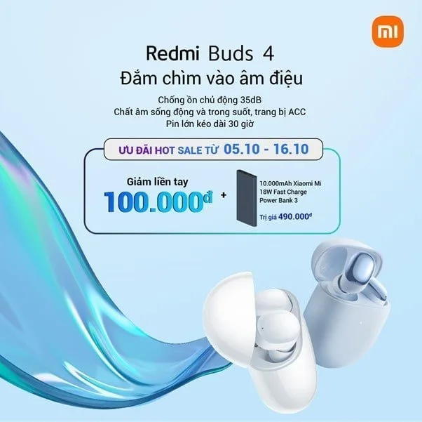 Remi Buds 4 có mức giá 1,590,000 VNĐ, đặc biệt, khi mua Redmi Buds 4 từ ngày 05 đến ngày 16 tháng 10, khách hàng sẽ nhận ngay ưu đãi giảm liền tay 100,000đ và nhận ngay Pin sạc dự phòng 10.000mAh Xiaomi Mi 18W Fast Charge Power Bank 3 trị giá 490,000đ.