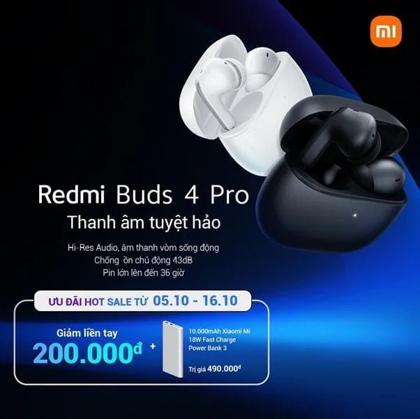 Remi Buds 4 Pro có mức giá 1,990,000 VNĐ, đặc biệt, khi mua Redmi Buds 4 Pro từ ngày 05 đến ngày 16 tháng 10, khách hàng sẽ nhận ngay ưu đãi giảm ngay 200,000đ và nhận Pin sạc dự phòng 10.000mAh Xiaomi Mi 18W Fast Charge Power Bank 3 trị giá 490,000đ.