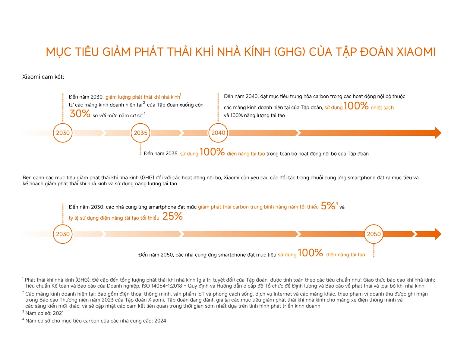 Bên cạnh việc đặt ra mục tiêu giảm phát thải khí nhà kính (GHG) cho hoạt động vận hành nội bộ, Xiaomi còn yêu cầu các đối tác trong chuỗi cung ứng điện thoại thông minh của mình xây dựng mục tiêu và kế hoạch giảm phát thải khí nhà kính, đồng thời sử dụng năng lượng tái tạo. Cụ thể, đến năm 2030, các nhà cung ứng trong lĩnh vực smartphone phải đạt mức giảm phát thải carbon trung bình hằng năm tối thiểu 5% (so với năm cơ sở 2024) và đạt tỷ lệ sử dụng điện năng tái tạo ở mức tối thiểu 25%. Mục tiêu dài hạn đến năm 2050 là đạt 100% điện năng tái tạo trong toàn bộ chuỗi cung ứng smartphone của Xiaomi.